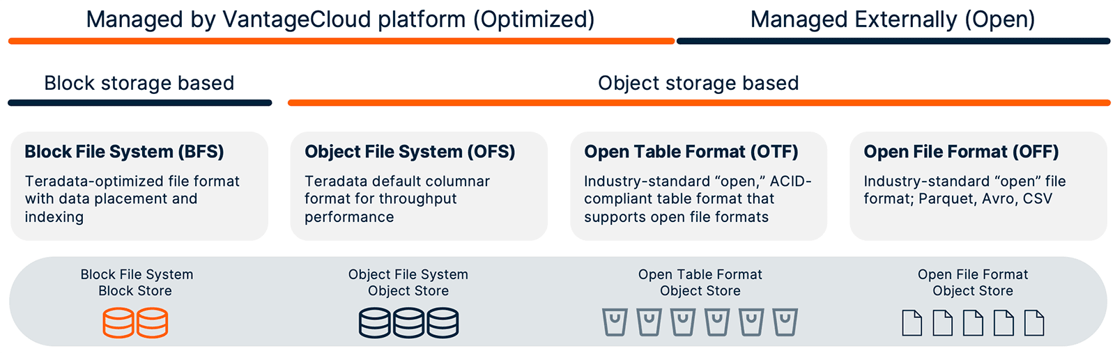 • Object storage: Teradata’s optimized object file system is designed for performance, leveraging a default columnar environment within an object storage system. These formats are tailored for high-speed data retrieval and efficient storage management, catering to workloads that demand quick access and processing.